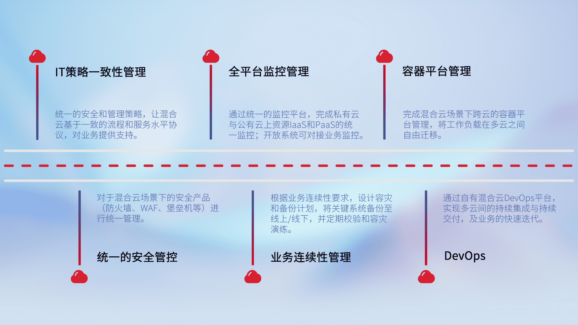 通过多云纳管,,以统一的资源数据模型把客户的云资源进行抽象和封装,,,,进而实现对多云资源的统一操作,,,,保障云资源管理的可靠性、、、稳定性与可用性。。量身定制化运维内容,,,配置、、、、开发运维、、、补丁管理、、、、备份、、、监控、、认证和访问管理、、、、审计和日常巡检等,,,保障在用云过程中的可靠度,,,,稳定度以及高可用率。。