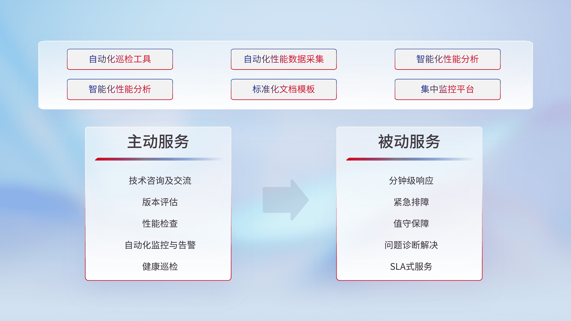 智能化工具和标准化文档,,,保障服务质量,,提供主动服务(包含技术咨询、、版本评估、、性能检查、、、、自动化监控与告警、、健康巡检)和被动服务包含(分钟级响应、、、、紧急排障、、、值守保障、、、问题诊断解决、、SLA服务)。。。